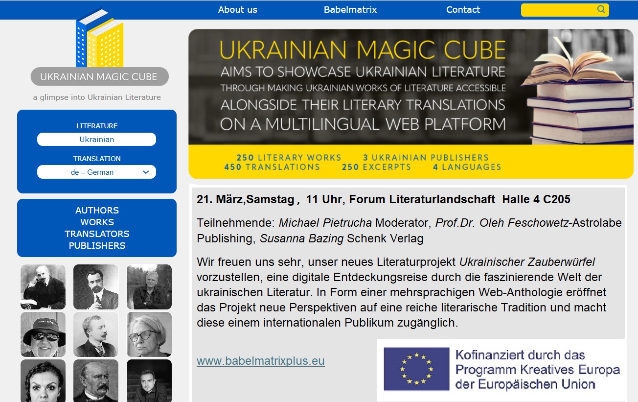 Wir freuen uns sehr, unser neues Literaturprojekt „Ukrainischer Zauberwürfel“ vorzustellen, eine digitale Entdeckungsreise durch die faszinierende Welt der ukrainischen Literatur. In Form einer mehrsprachigen Web-Anthologie eröffnet das Projekt neue Perspektiven auf eine reiche literarische Tradition und macht diese einem internationalen Publikum zugänglich.